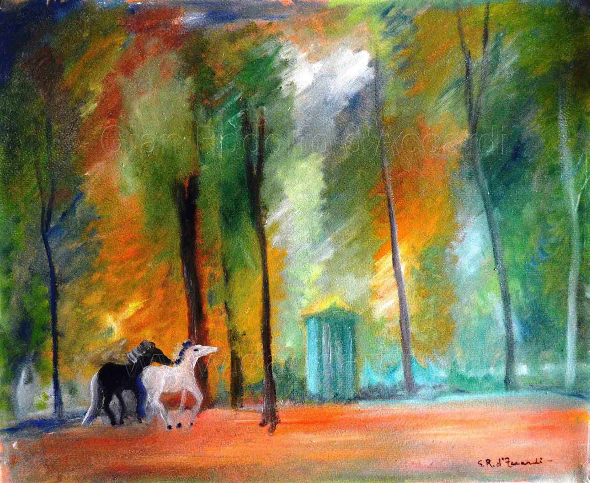 His little horses, for which he is famous, are not related, even if distantly, to the greater ones of De Chirico. They are like the style of this world of his that expresses itself through a courageous colour scheme and a chastity of tonal combinations that strikes and fascinates.”
