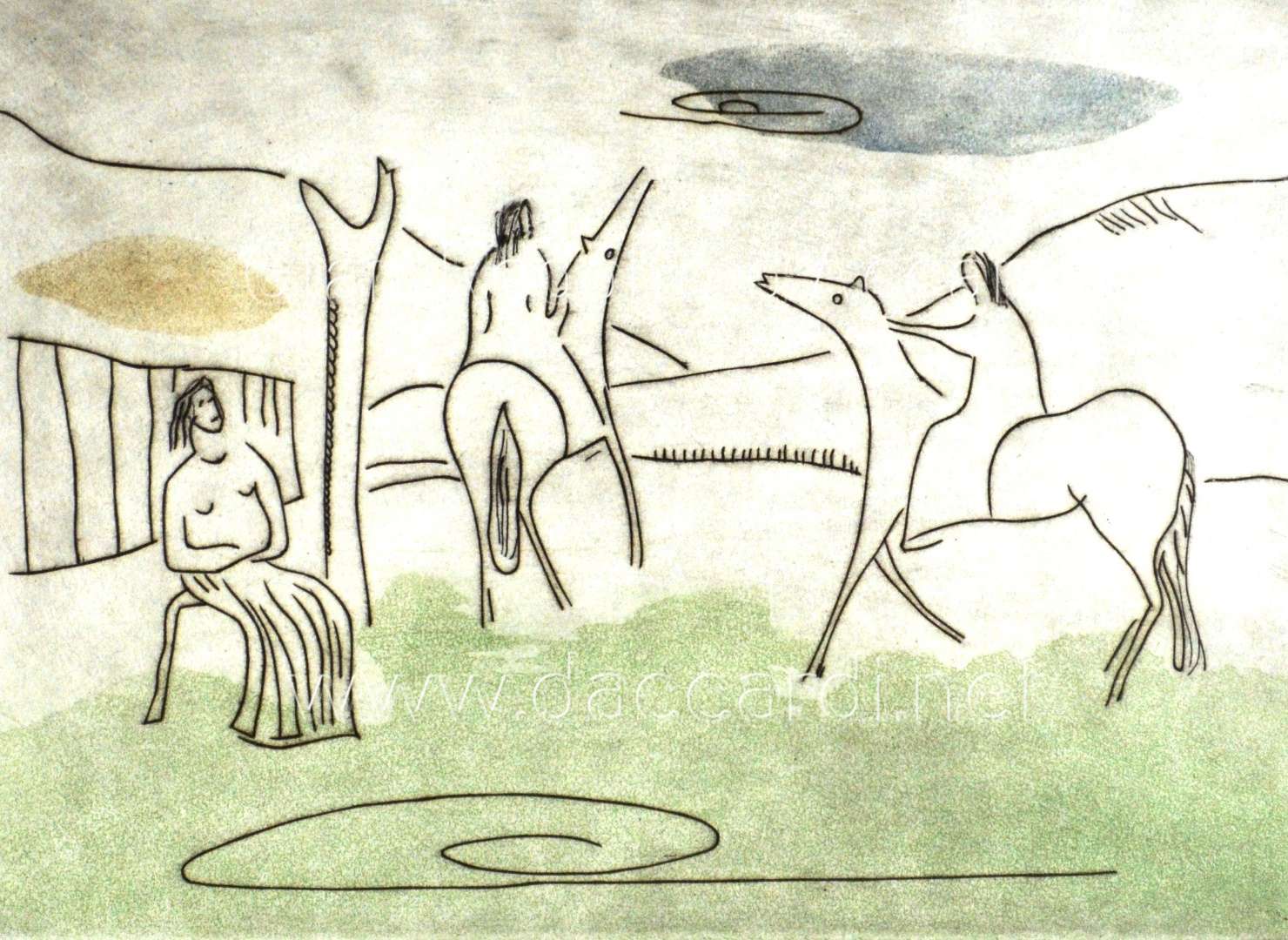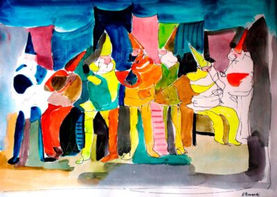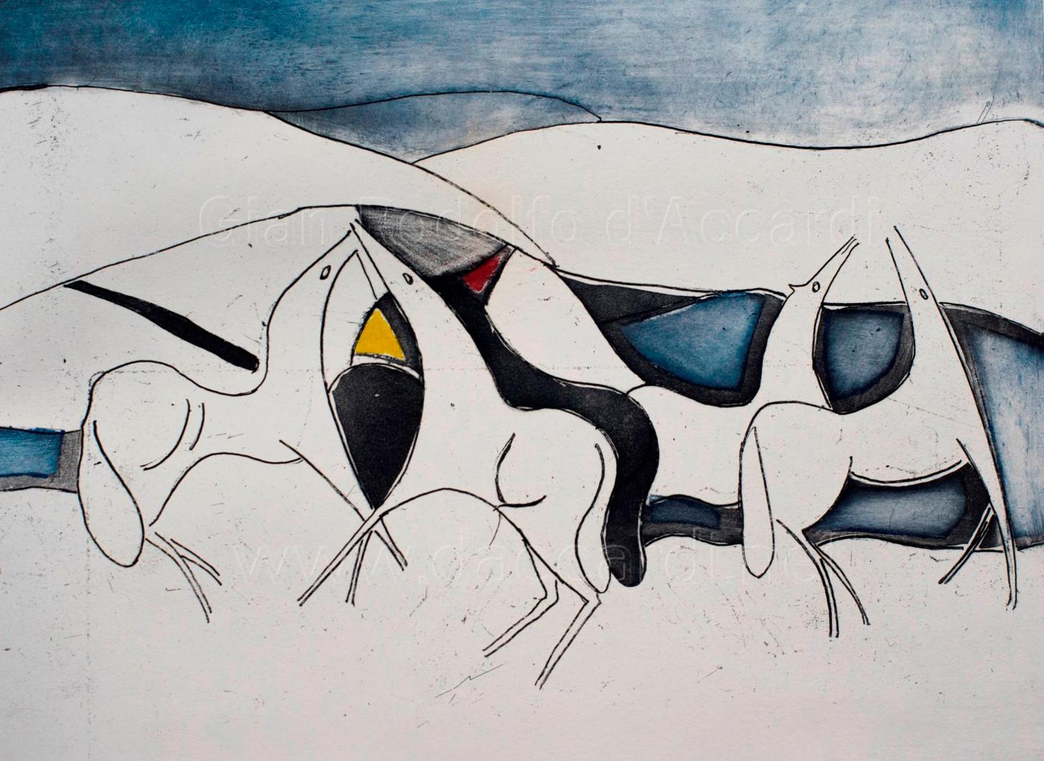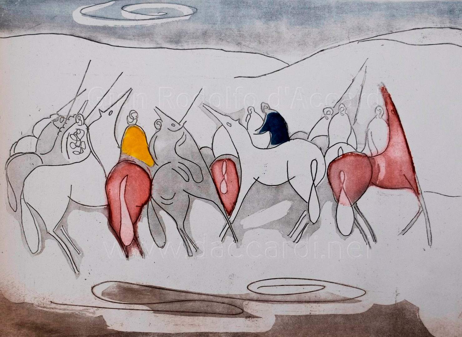 “Within a strenuous control of sign, the figure of d’Accardi moves with apparent instability, whilst it is applied to the needs of sentiment and the mobility of themes in their most explicit compositional immediacy. “Clowns” and “knights” expand – in their fantastic ephemerality – a lyric pantomime of events and memories, of extreme and whirling silences, through a flexible spelling out (of the sign) within innocent and happy images, void of contingent problems, and proposed by a sensitive Platonic and mechanical metaphor of bodies and spontaneous games.”