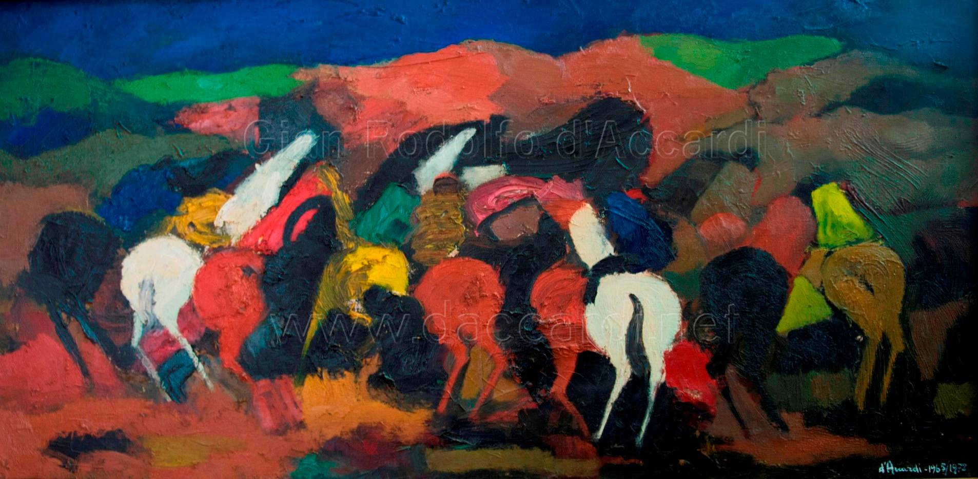 “If the painter’s attention shifts from the generous conflict of the greens, of the vegetal jubilation that is exalted even in the blinding whiteness of the snow, he also seeks a humorous and exciting event where the disparate effects of the colours and the passionate movements can be combined, aimed in their production at a mental level. He paints something that can finally be called the proposal for A Battle; the conflict of horses and bodies, but above all that of nerves and sensitivity. His poetry becomes epic without losing any figure deeply delighted in the intensity sought in the chromatic fibers, in the unexpected and mobile support around which the figures are wrapped.”