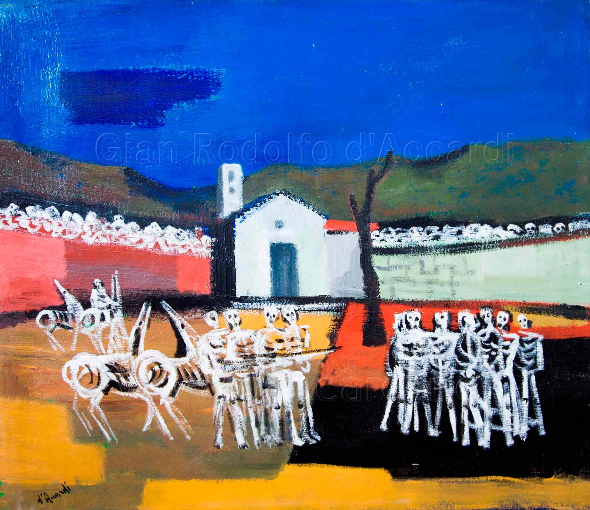 “D’Accardi si esprime con colori vivaci e armoniosi e con forme fantasiose talora suggerite dal suo estro, talaltra dettate da una sincera passione. Egli è profondamente religioso. Mi pare dunque cosa naturale che l’opera migliore esposta sia una grande Crocifissione. Basta questa tela a illuminare la vasta sala dell’esposizione. Anche nel quadro intitolato Fucilazione v’è una drammaticità vivacissima. Questi due dipinti mi sembrano i migliori della mostra soprattutto perché, in ciascuno di essi, colori e forme, dal punto di vista puramente formale, sono i veri protagonisti del dramma suscitato dal «soggetto». Voglio dire che la drammaticità di queste opere non è esteriore o superficiale, non proviene da dislinquimenti delle figure o dai loro medesimi atteggiamenti ma quasi unicamente dal modo stesso in cui sono stati concepiti colori e forme.”