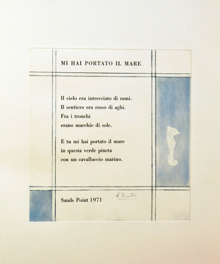 La cartella, stampata su torchio a mano in cinquanta esemplari numerati in occasione dell’Esposizione di Grafica di d’Accardi alla Biblioteca Comunale Palazzo Sormani di Milano, raccoglie sette incisioni, introdotte dalla poesia Mi hai portato il mare.