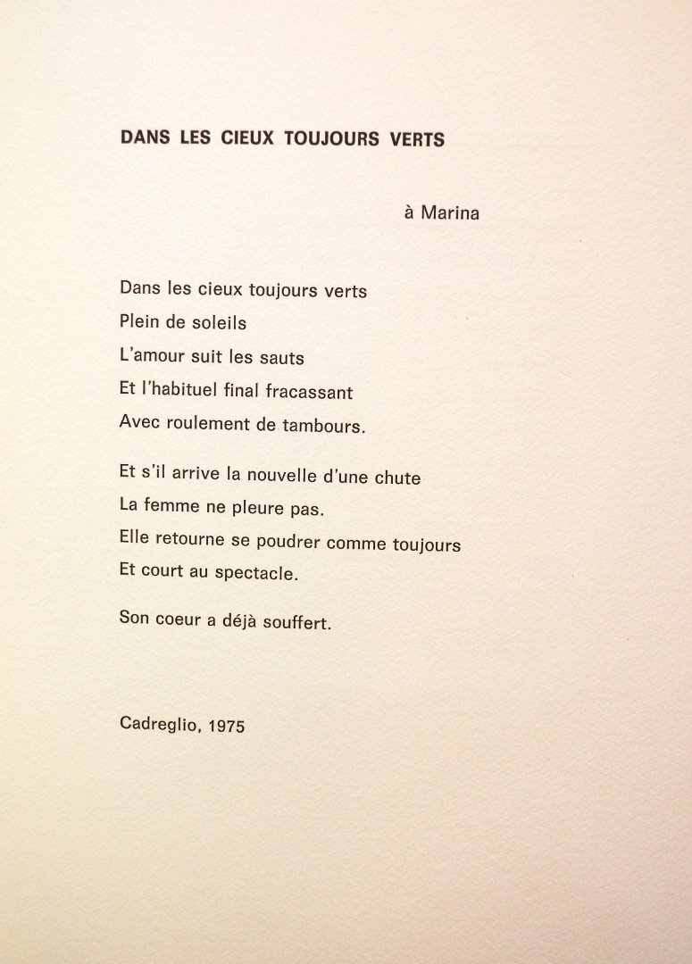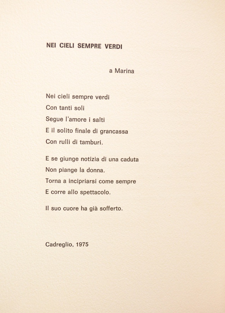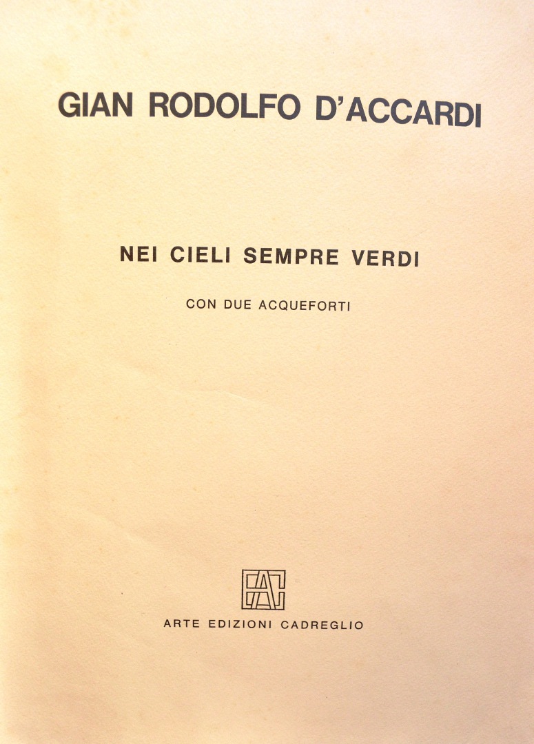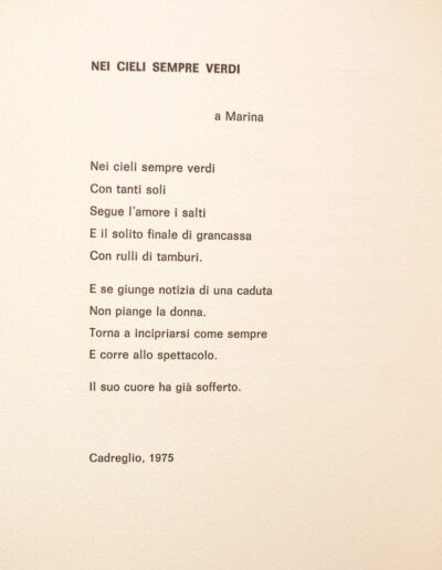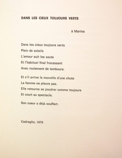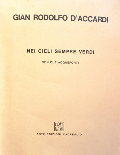Nei cieli sempre verdi Arte Edizioni Cadreglio (1981) Cinque poesie sono qui presentate insieme con la loro traduzione in francese ad opera di Marguerite Attias, chevalier d’Académie. Due acqueforti impreziosiscono l’opera. Contattaci Scrivici una mail, ti risponderemo al più presto Nome Email Messaggio Privacy Policy Privacy Policy Autorizzo il titolare del trattamento al trattamento dei miei dati personali per l’invio di comunicazioni relative alla presente richiesta di contatto (Dlgs 196 30/6/2003) Invia
