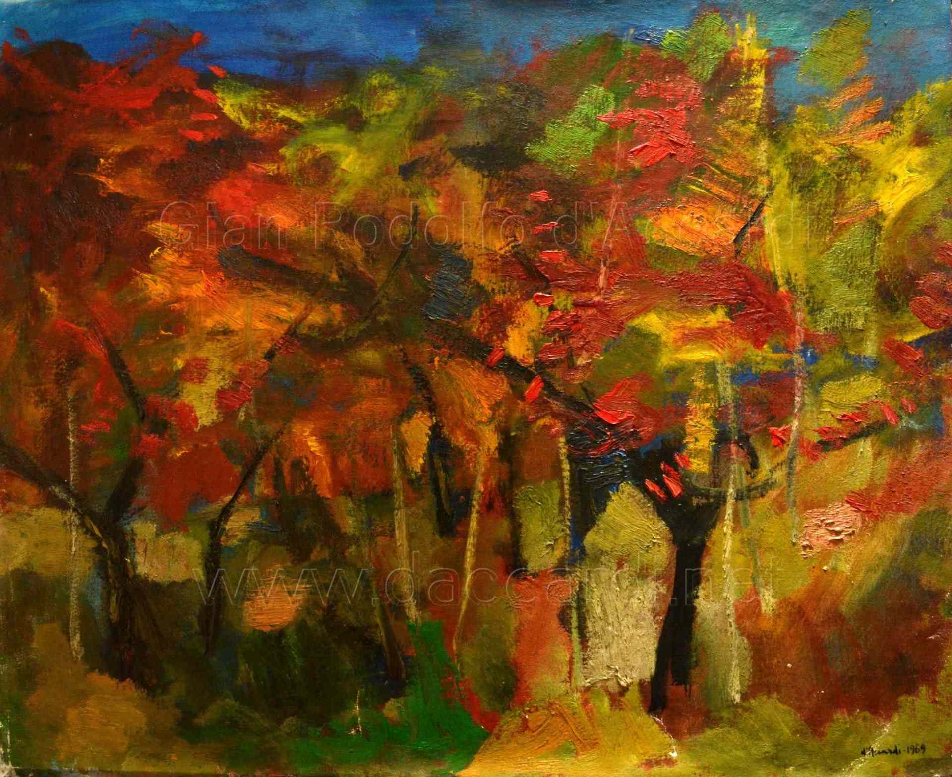 “Carattere dominante, preponderante impressione nella pittura di d’Accardi è questo colore, steso in impasti densi, ricchi, traboccanti di luce e di energia, un colore puro, assoluto, pieno, però mai sforzato o esibizionistico; un colore che si può quasi pensare ma non è mai pesante. I suoi boschi vivono dunque nel colore, sono boschi di fiamma inventati con una luce violenta e nello stesso tempo armoniosa.